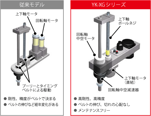 また、アルミ押出技術による軽量設計によって同可搬質量の従来スカラ「YK1200X」から約25%削減しつつ、鉄製ベースによる剛性を維持することで、安定した動作と搬送効率向上を両立しています従来通りティーチングボックスから数値で設定することで簡単かつ正確に設定できます。