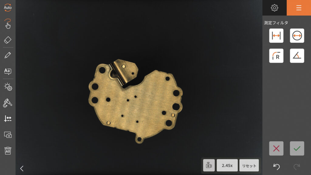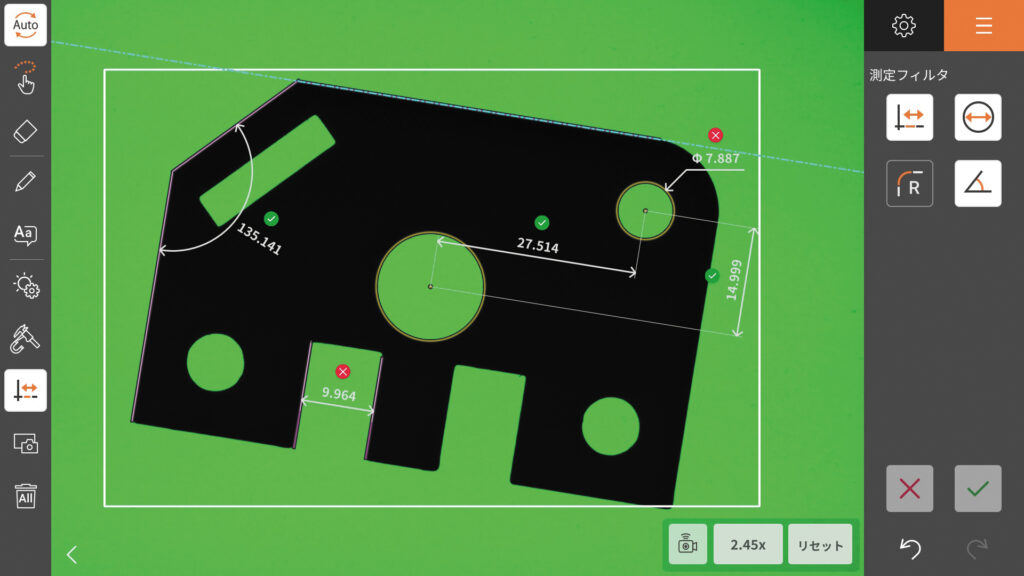 ワークを測定テーブルに載せるだけで自動検出により円や直線を自動で認識します。