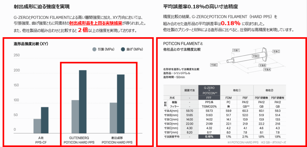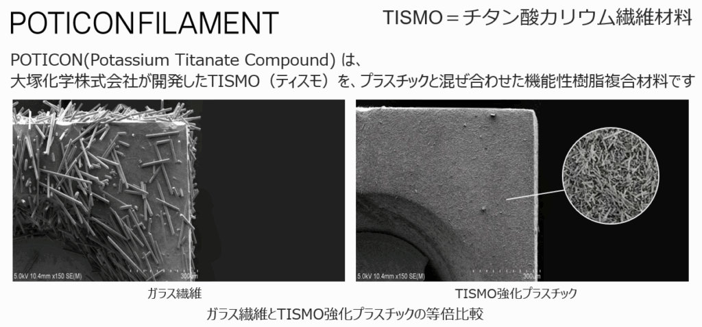 大塚化学株式会社が開発したPOTICON フィラメント、PPS(RT4、 RT4E)、PA(NTL34M、NTL36、NTU62)などの機能性樹脂複合材料を使用することで更に高強度・高精度の実現可能となりました。